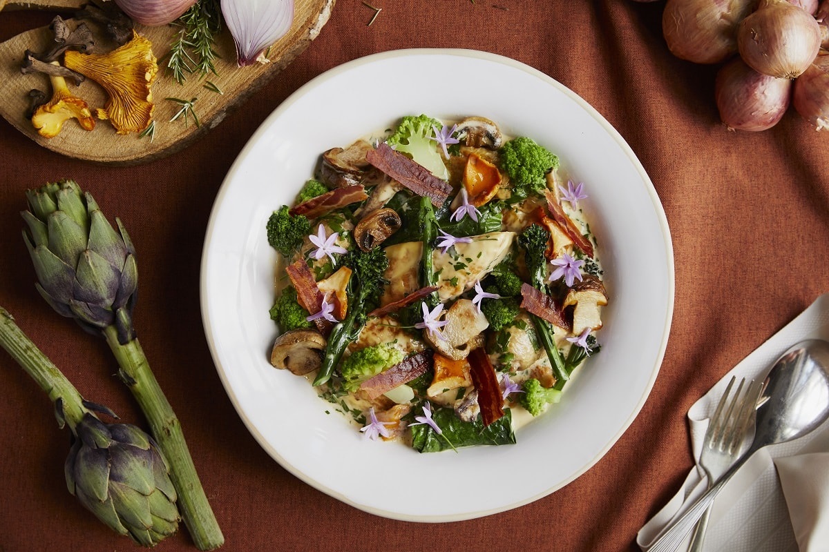 Cotswold White Chicken with Brassicas and Smoked Bacon by Adam Smith of Coworth Park
