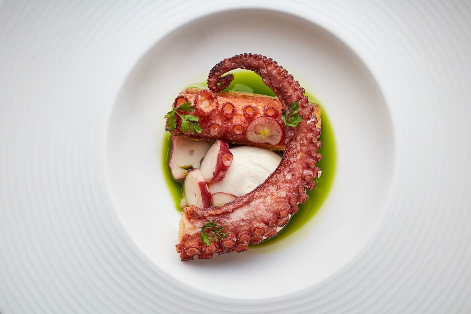 Presenting: Octopus, Almond bread sauce, Grapes, Chervil. This dish is available on the Spring menu two course £55, three courses £69, and on the Tasting Menu five courses £95 pp.