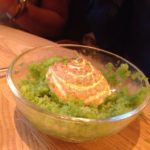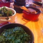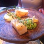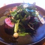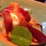 I’m going to leave Blister till last for this one as she was our ‘problem child’. Bro-in-law went for the star fish dish of Monkfish Cooked Over Pine, puffed barley, fennel (28) which apart from a tiny complaint that he would have liked more fennel was again enjoyed with gusto. Best-friend had the Roasted Turbot, seaweed fregola, cucumber and creme fraiche (30). She declared the fish a triumph, expertly cooked in fact, but found the rest of her dish slightly too pureed and lacking in texture.  This was not helped by the sides that we had jointly ordered of creamed spinach and, surprisingly, pureed sweet potato. I guess we should have checked first. I chose the Chargrilled Iberico Pork, raw and roasted turnips (29). Now this was a first for me – not Iberico Pork, but the fact that chef recommended it be cooked rare. I thought pork was one of those meats that killed you if under-cooked but I trusted our chef and am obviously here to tell the tale. The meat was indeed good enough to take a long pause over. The wincingly intense seared exterior giving way to melt in your mouth pink, garlicky, slightly smoky flesh. The roasted turnips were not my cup of tea but I tried them anyway as a more solid alternative to the pureed sides which were beginning to taste a bit like posh baby food.