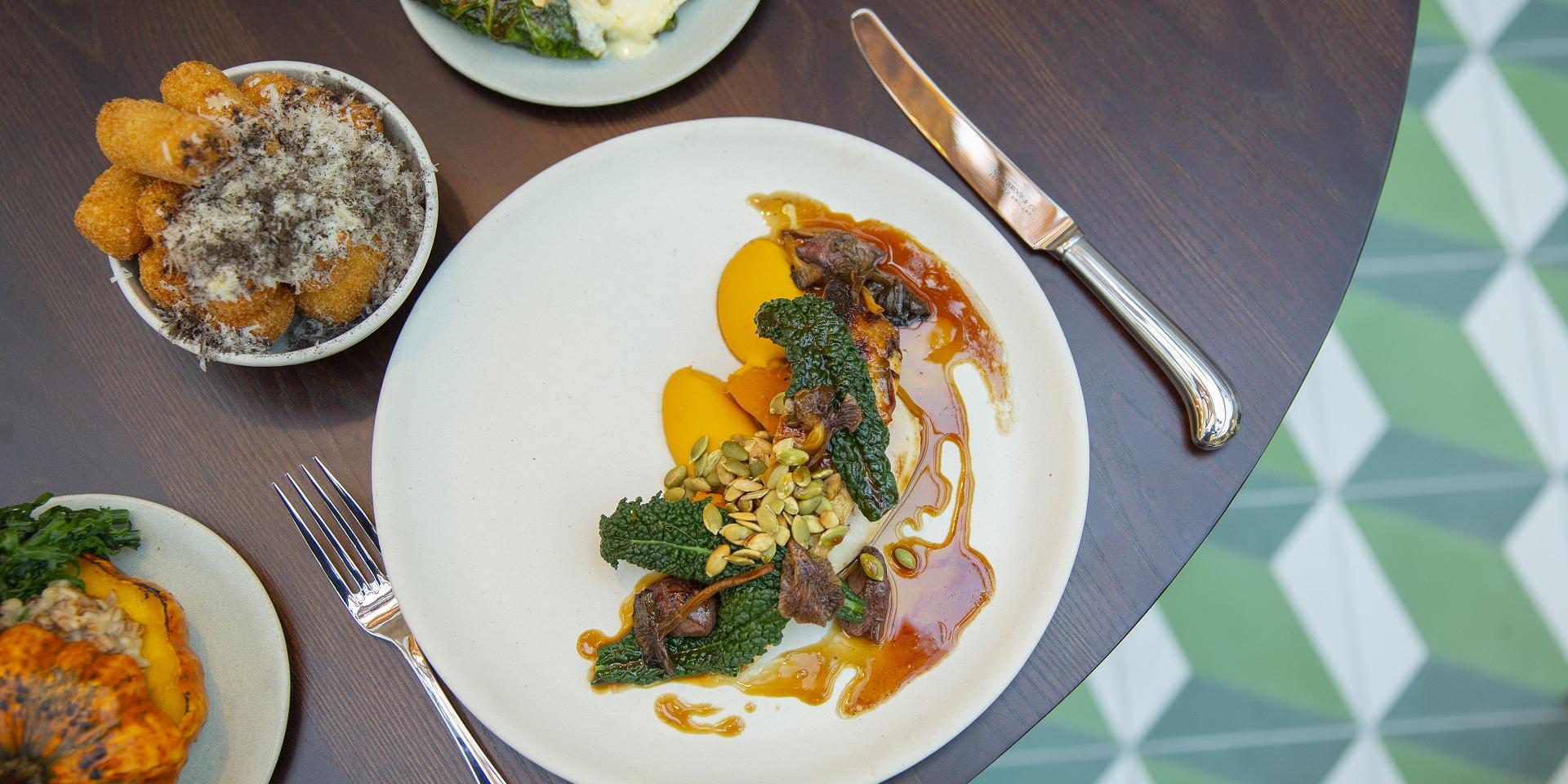 In the restaurant, guests enjoy a menu of seasonally changing dishes from head chef Dan Fletcher. Example dishes for the January opening include Fallow deer, beetroot, red cabbage and preserved blackcurrants, Cornish red chicken, delica pumpkin & chanterelles on sourdough toast and Pollock with wood-fired leeks, St Austell bay mussels & sea vegetables, and decadent sharing roasts on Sundays. Vegetarian options will include Stuffed Harlequin squash, hen of the woods mushroom and confit egg yolk.