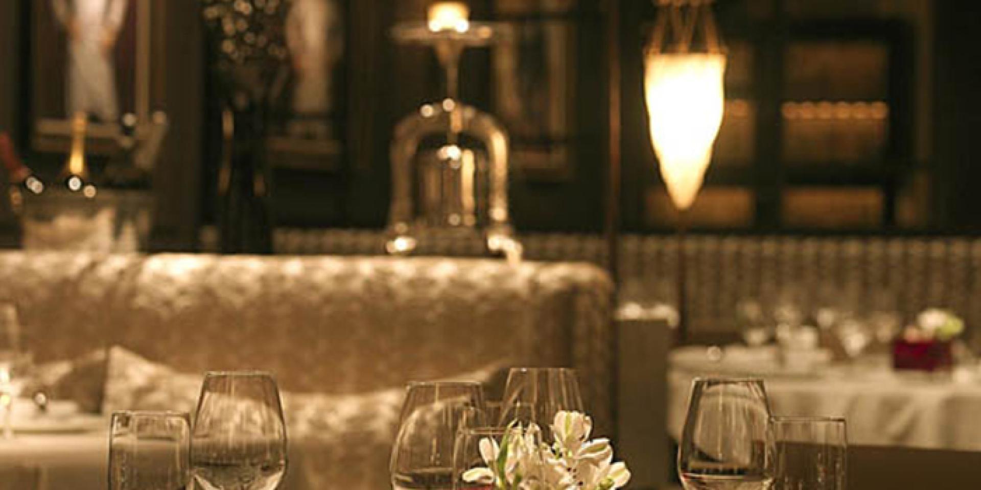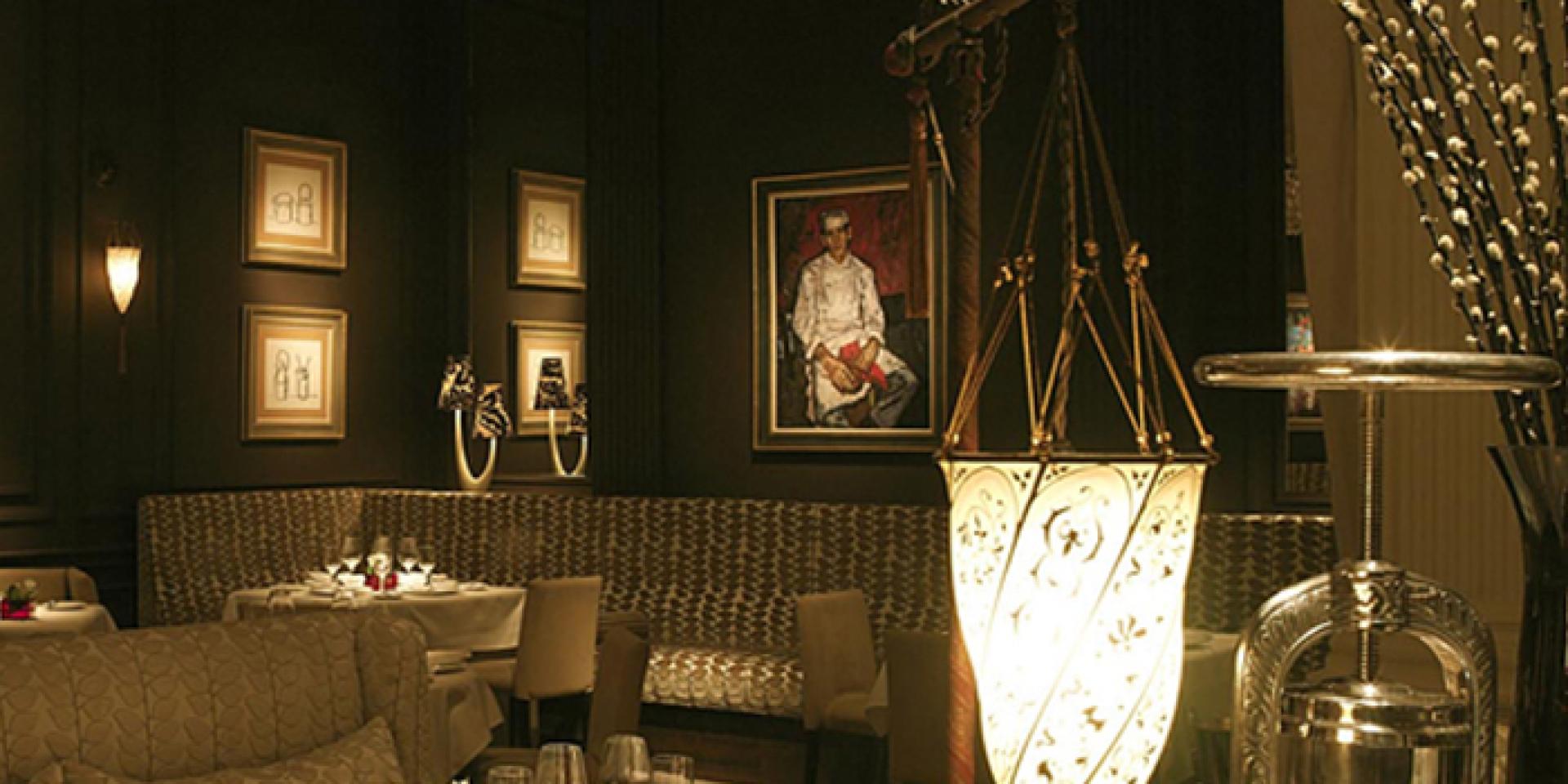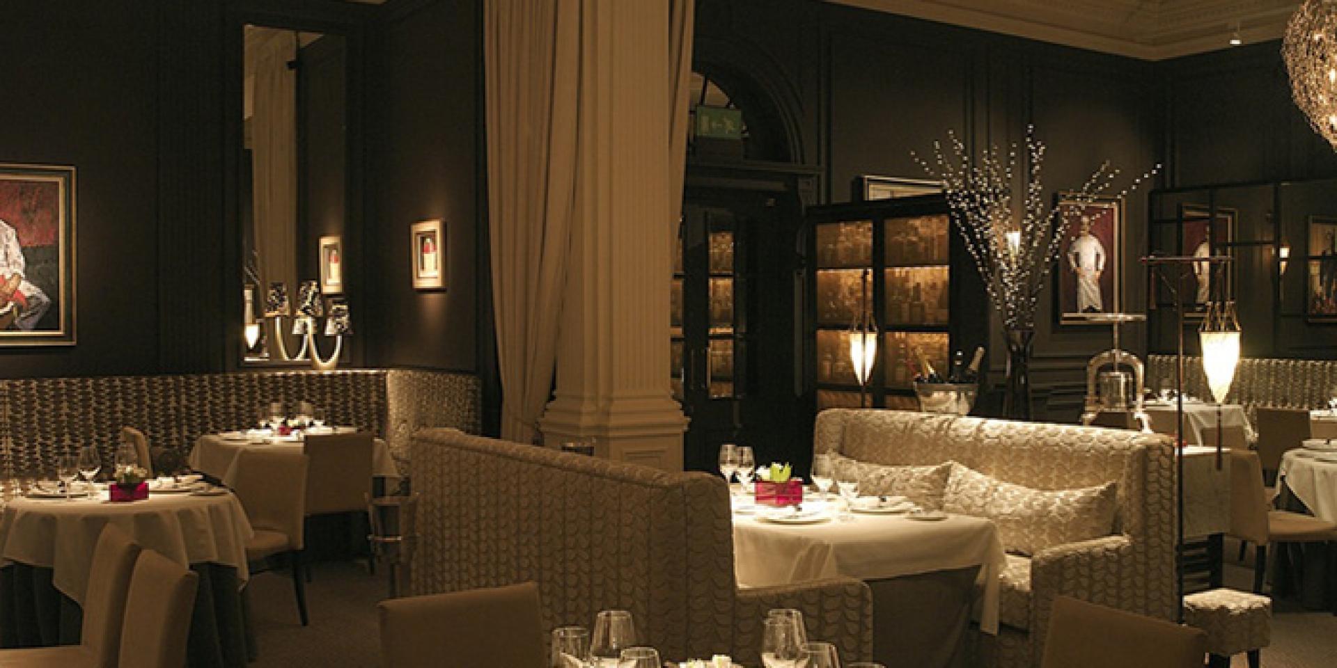 Classic white table cloths with diffused lighting, soft and light chenille furnishings and lively paintings hung dramatically on dark coloured walls.