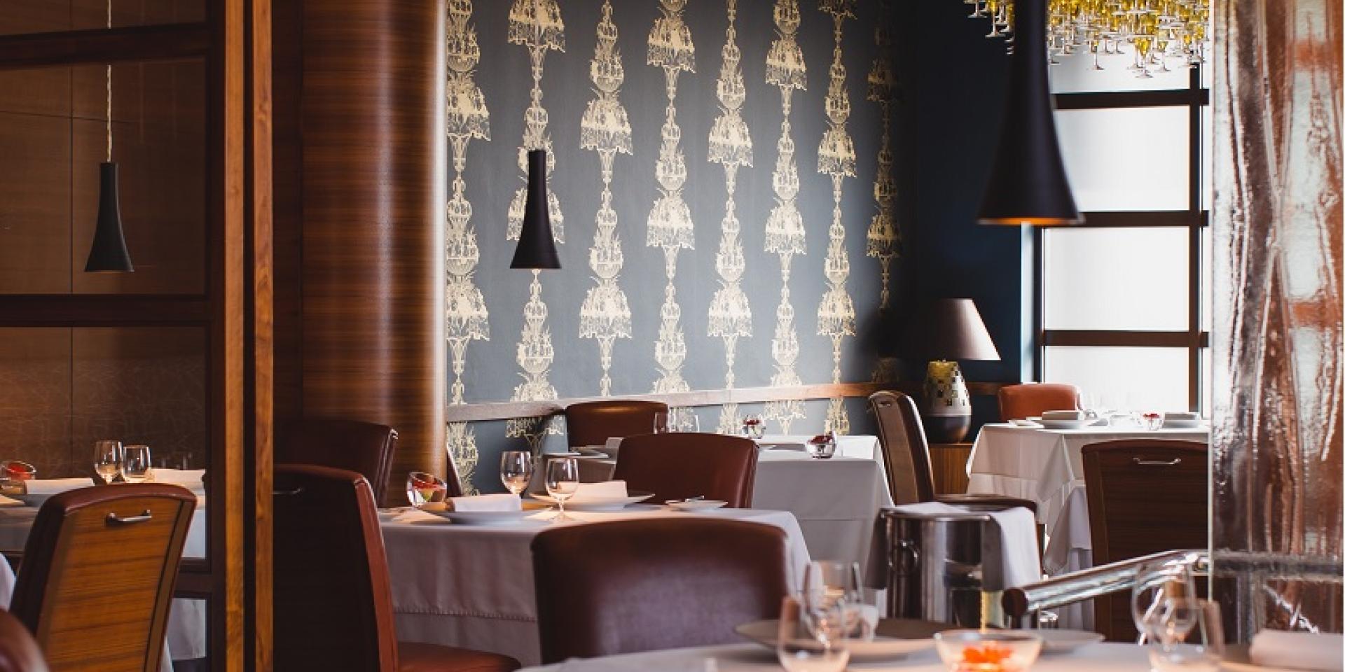Bohemia's private dining area has been completely transformed and now oozes lavish style. One wall has been clad in statement blue matt wallpaper, featuring an intricate gold design. A wall of panelled frosted glass to the front of the restaurant allows natural light to flood into the restaurant, whilst maintaining its discreet ambience.