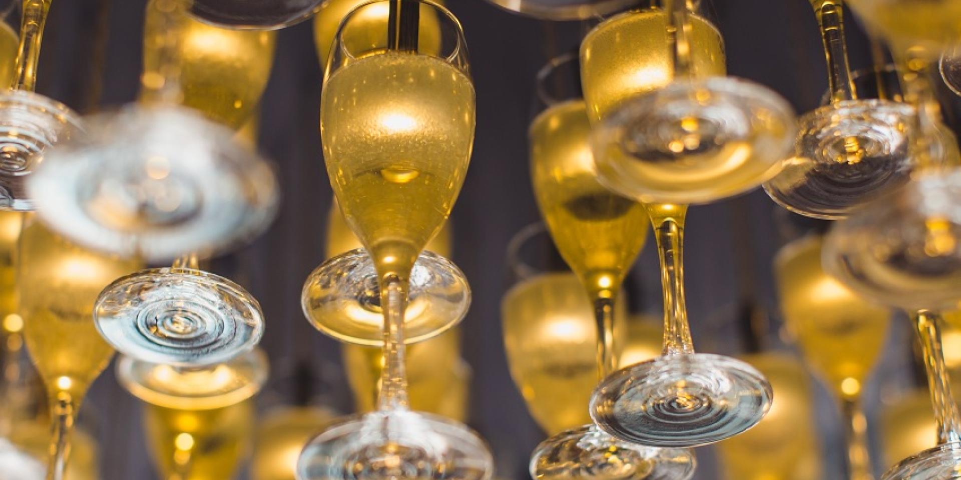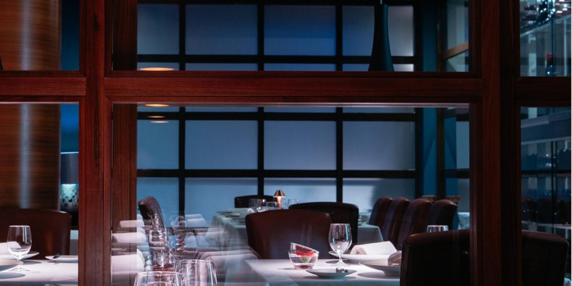 The crowning feature of the private dining room is a statement chandelier made from 200 Champagne glasses. Each glass is individually illuminated with glowing effervescent 'Champagne' to give the illusion that it has just been poured.