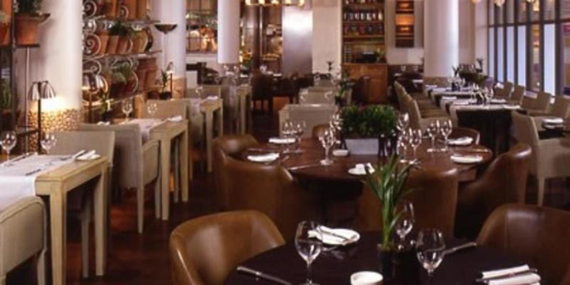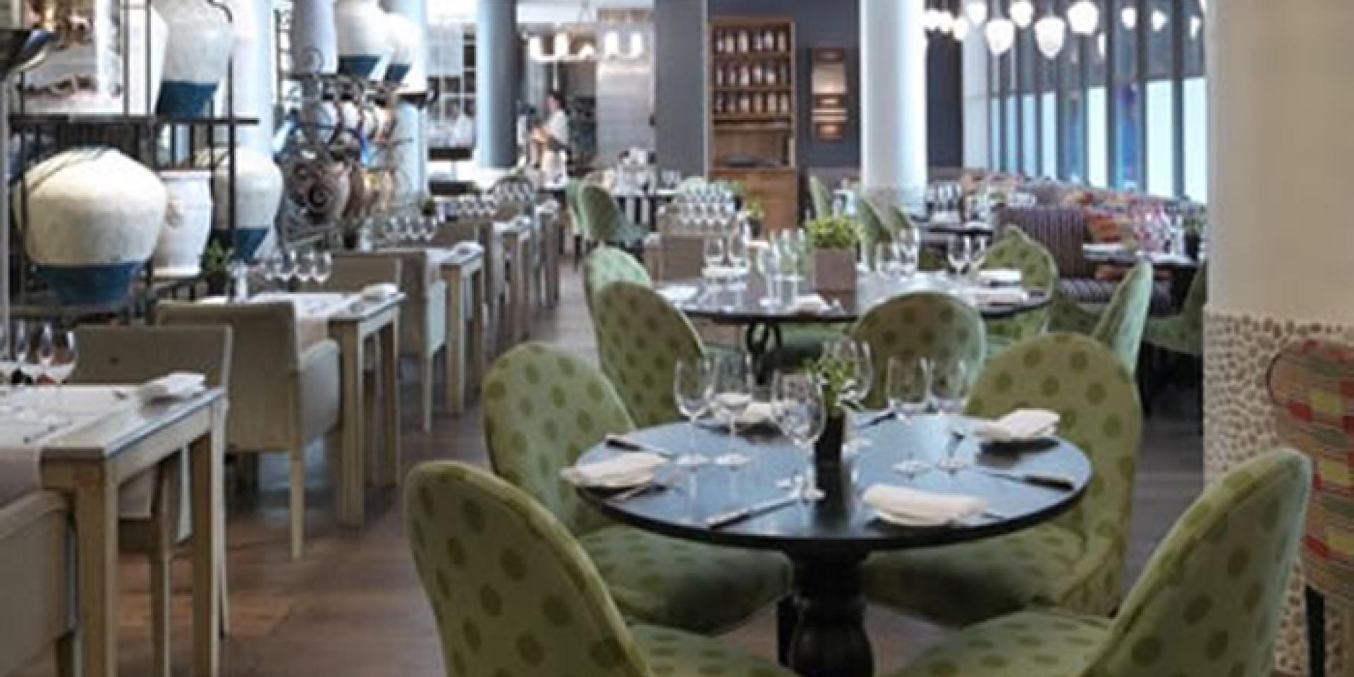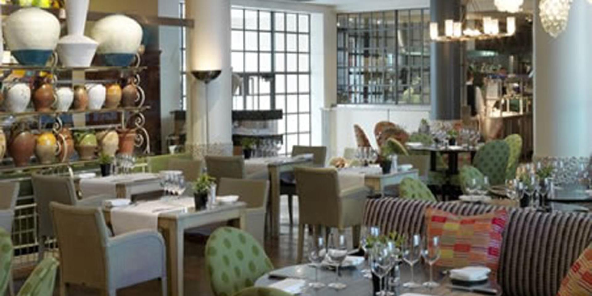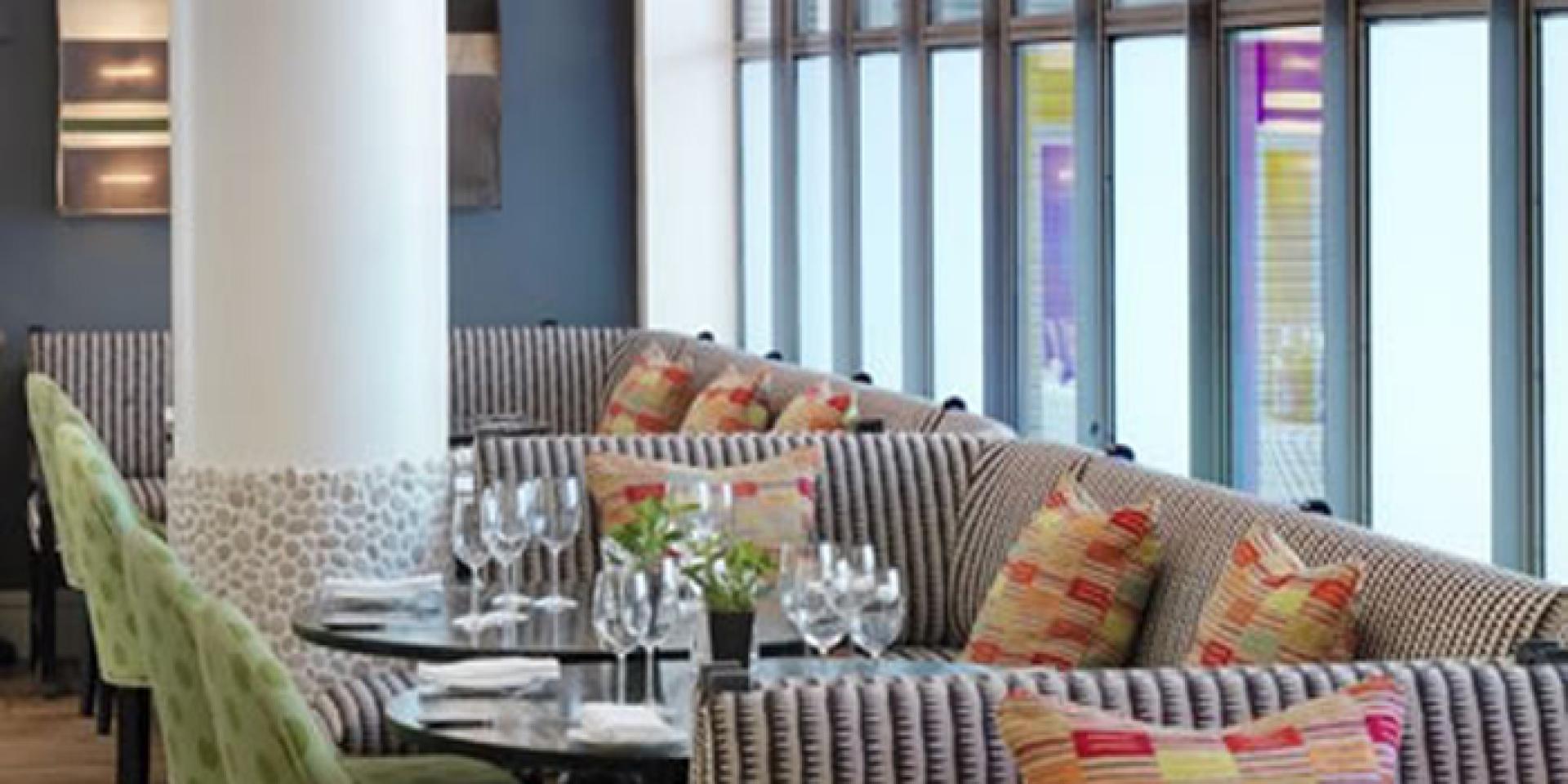 The relaxed brasserie / bar style dining room is spacious and light with neutral tones and leather furnishings. The feature focal point is definaltey the statement pewter bar commissioned by London born artist Alexnder Hollweg.